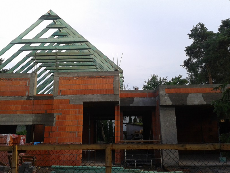 I nowoczesny nabiera kształtów … od ostatniego wpisu trochę się zmieniło; zostały usunięte rusztowania pod stropem, oraz w środę została zbudowana więźba dachowa. Poszło bardzo sprawnie, panowie w licznie 8 osób przyjechali o 7 rano, a o 17 odbierałem gotową więźbę. W przyszłym tygodniu zostaje nam dokończenie ścian szczytowych (już są częściowo zbudowane, ale nie zrobiłem zdjęć) i ścianek działowych; tak że w przyszłym tygodniu kończymy stan SSO :))))